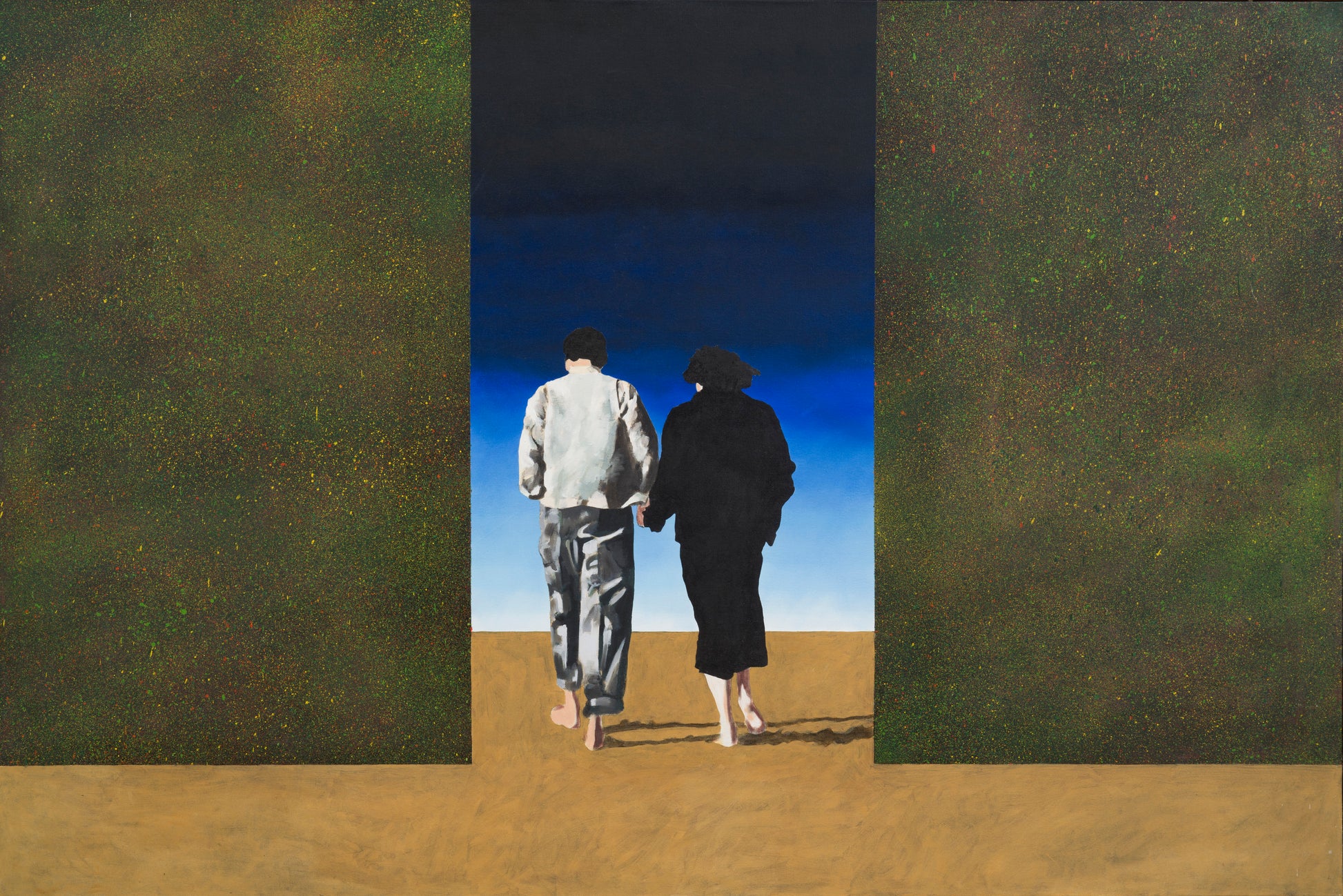 A Practical Guide to Aesthetics by postmodern artist Anthony Lawrence is a striking oil on canvas from 1992, measuring 102cm by 153cm. The work captures a barefoot couple walking hand in hand through a doorway toward a luminous blue sky, their figures seen from behind on golden sand. This piece exemplifies Lawrence’s ability to merge intimate human moments with expansive, evocative settings, inviting reflection on connection and transition within a dreamlike landscape.