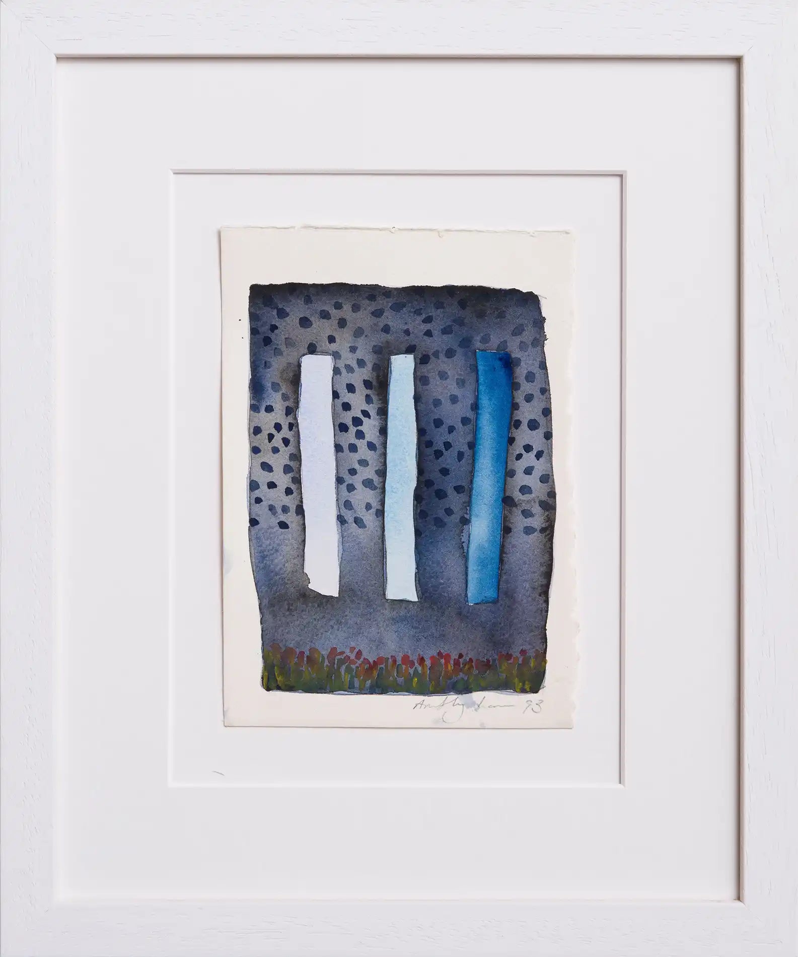 This framed watercolour piece by postmodern artist Anthony Lawrence, entitled Deconstructed Blend and Flowers, features a mottled background set against three separate stems and an expanse of red blossoms. Painted in 1993, it demonstrates an elegant fusion of abstract and floral components. The artwork measures 20.5cm by 14cm.