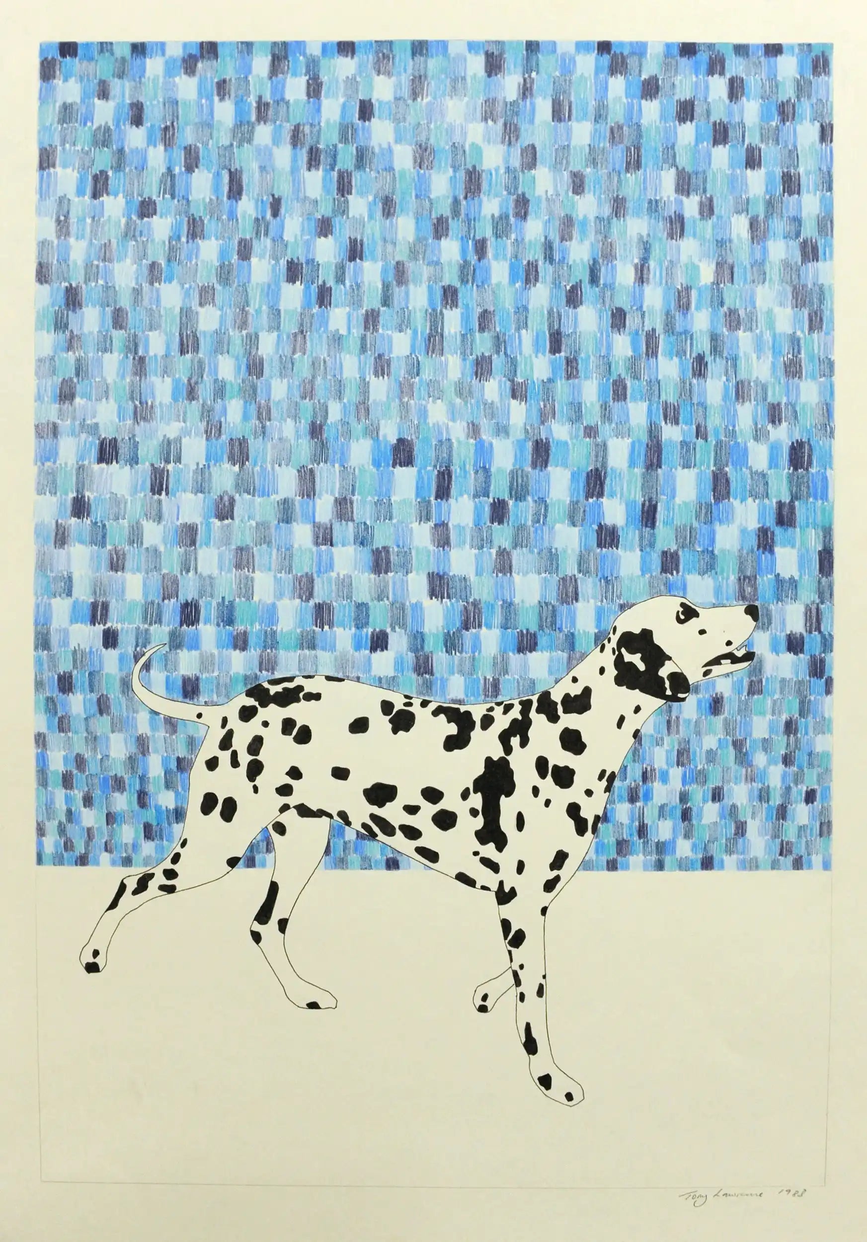 “Dog on a Kissing Mission” by postmodern artist Anthony Lawrence showcases a striking Dalmatian against a vivid blue backdrop. Created using pencil and Caran d’Ache crayon on paper in 1988, this 41cm x 31cm artwork exemplifies Lawrence’s skillful blend of delicate drawing and vibrant colour, capturing both charm and artistic sophistication.