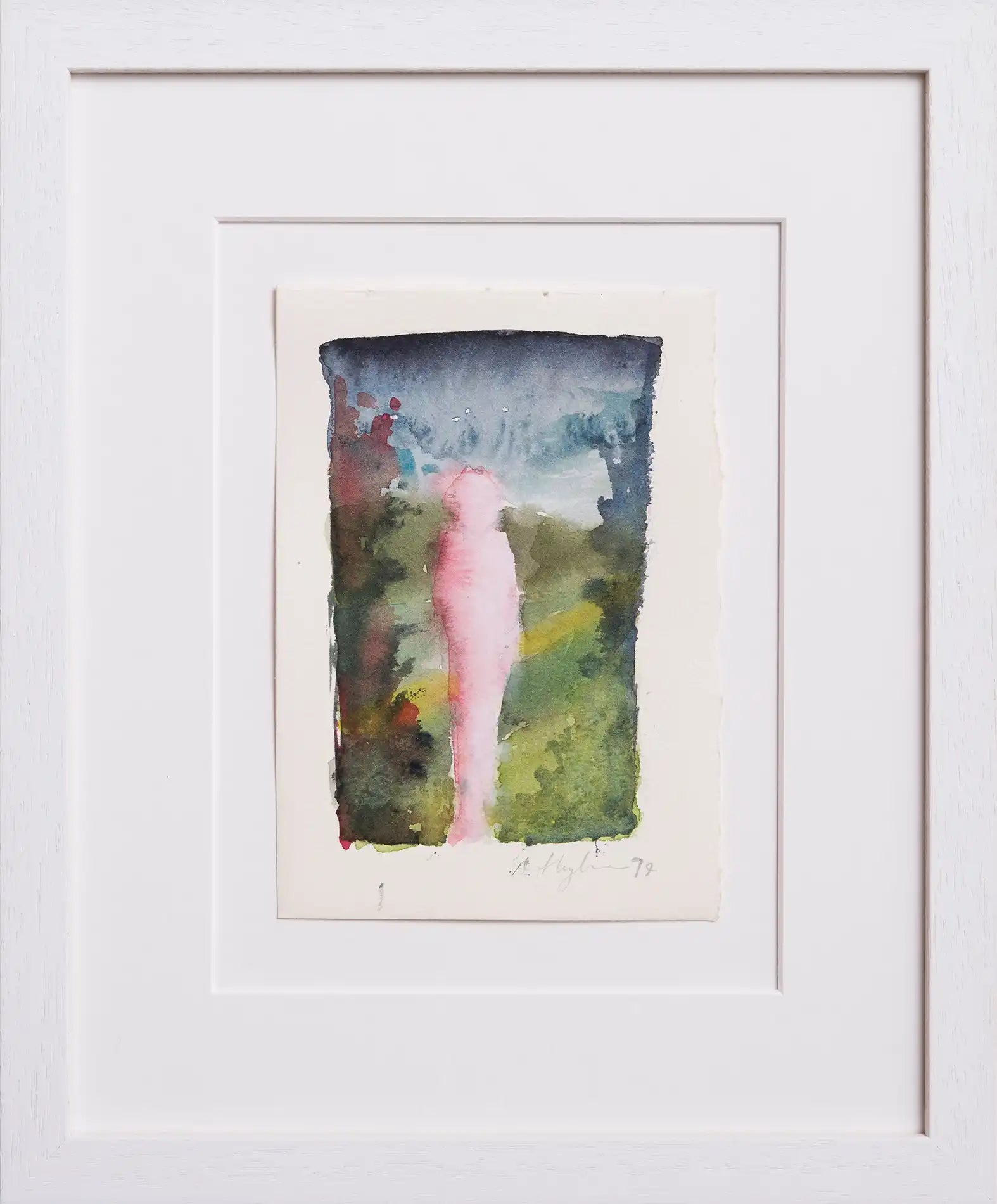 Faith Hope and Charity Study is a 1994 watercolour by postmodern artist Anthony Lawrence, featuring a figure set against a backdrop of sky and hills. The artwork measures 21cm by 14cm.