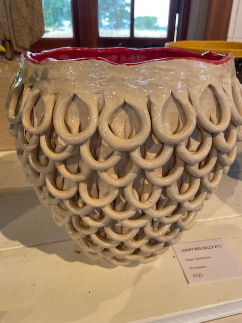 This hand-thrown ceramic vessel features an intricate exterior of looped forms that invite tactile exploration. The interior reveals a vibrant red glaze, creating striking contrast between the textured outer surface and the luminous glazed cavity within. Executed by the skilled artisan ceramicist, Peter McGinnis, the piece demonstrates refined control of clay and glaze application. A sophisticated functional artwork that merges sculptural sensibility with practical form.