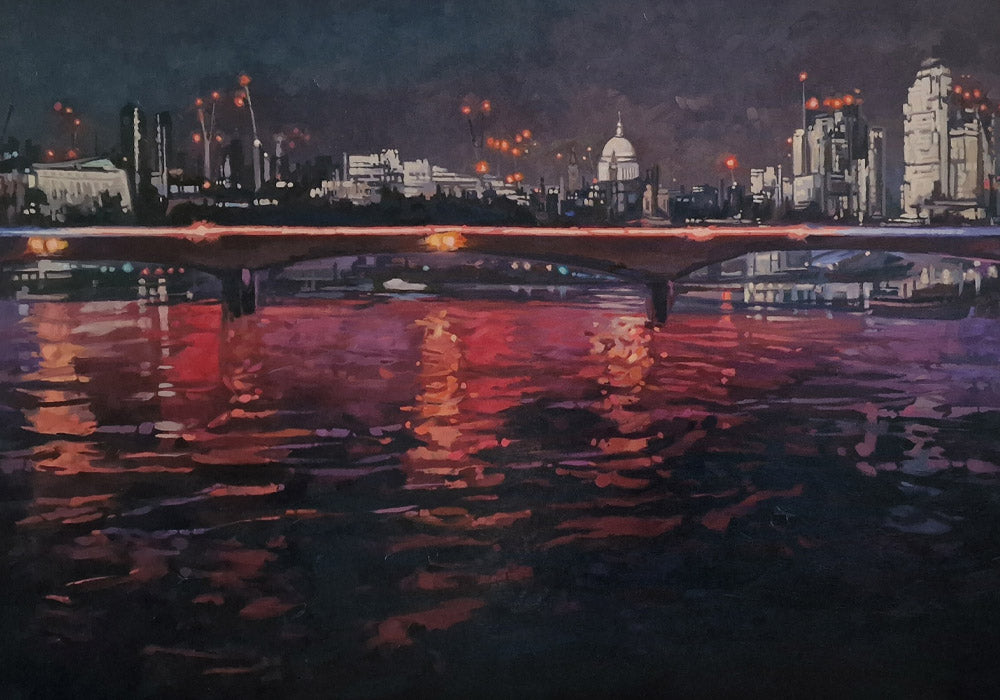 Crafted by Paul Mitchell, an Associate member of the Royal Academy of Marine Artists, this oil painting captures the luminous essence of London's iconic nocturnal landscape. The composition centres on Waterloo Bridge, with St Paul's Cathedral and the city skyline rendered in atmospheric detail.