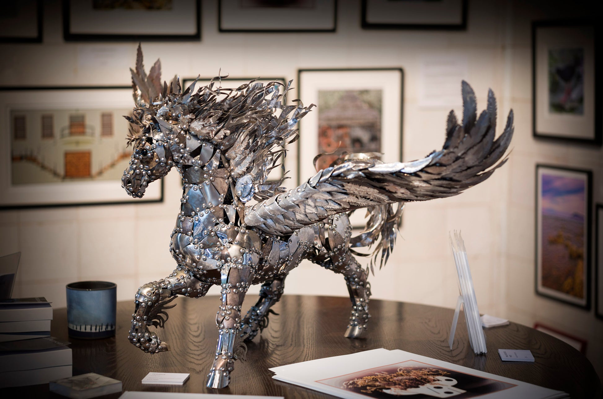 Pegasus is an expertly crafted flying horse sculpture made entirely from recycled and reclaimed metal. Handmade without welding, this piece showcases sustainable artistry through precise, environmentally conscious assembly methods. Its dynamic design captures movement and strength, making it a distinctive addition that embodies both craftsmanship and eco-friendly values.